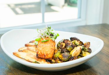 Honey-Dijon Salmon Served with Lemony Potato Wedges and Roasted Brussel Sprouts