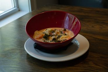 Creamy Tomato-Based Soup with White Beans, Tortellini, and Greens