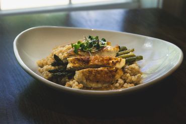 Seared Chicken Breast over Couscous Pilaf and Sauteed Asparagus. Topped with Creamy Lemon and Roasted Garlic Sauce