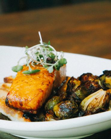 HONEY-DIJON SALMON SERVED WITH LEMONY POTATO WEDGES AND ROASTED BRUSSEL SPROUTS