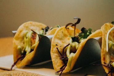 BEER-BATTERED COD, CHIPOTLE SLAW, PICKLED RED ONIONS, AND AVOCADO ON CORN TORTILLAS