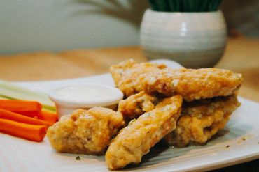 SERVED WITH CARROTS, CELERY, AND RANCH OR BLEU CHEESE DRESSING.