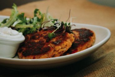 SEARED SALMON CAKES WITH RED PEPPER AND SCALLION. SERVED WITH LEMON AND DILL SAUCE.