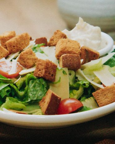 ROMAINE LETTUCE, CAESAR DRESSING, CROUTONS, SHAVED PARMESAN CHEESE, CHERRY TOMATOES.