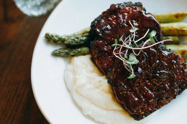 SAVORY MEATLOAF GLAZED WITH SWEET AND SPICY BARBECUE SAUCE. SERVED WITH MASHED POTATOES AND GARLIC BROCCOLI