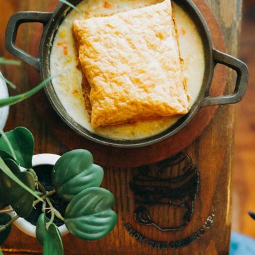 CHEESY LASAGNA FILLED WITH HERB RICOTTA AND TOMATO SAUCE. SERVED WITH GREEN SALAD.