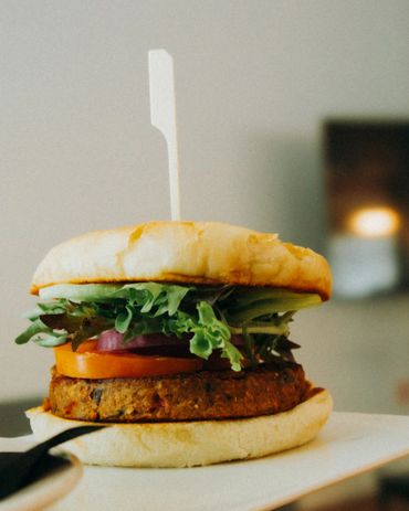 BLACK BEAN AND SWEET POTATO BURGER TOPPED WITH LETTUCE, TOMATO, RED ONION, AND CREAMY VINAIGRETTE. SERVED WITH SWEET POTATO FRIES