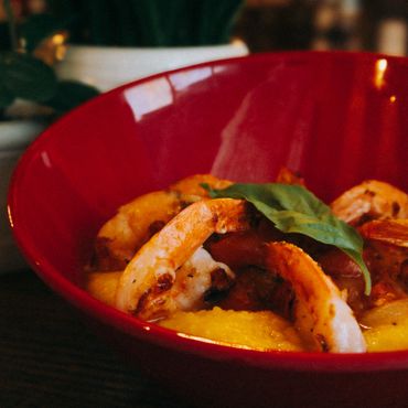 Creamy Parmesan Polenta with Seared Shrimp and Blistered Tomatoes in a Tomato Basil Broth.