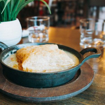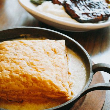 Chicken Pot Pie Filling with Peas, Carrots, and Corn. Topped with Puff Pastry.