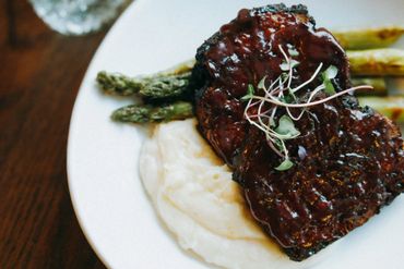 Savory Meatloaf Glazed with Sweet and Spicy Barbecue Sauce. Served with Mashed Potatoes and Lemon-Garlic Asparagus