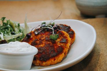 Black Bean and Sweet Potato burger topped with Lettuce, Tomato, Red Onion, and Chickpea Spread. Served with Sweet Potato Fries