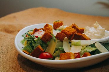 Romaine Lettuce, Caesar Dressing, Croutons, Shaved Parmesan Cheese, Cherry Tomatoes.