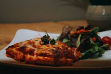 Cheesy Lasagna Filled with Herb Ricotta and Tomato Sauce. Served with Green Salad.